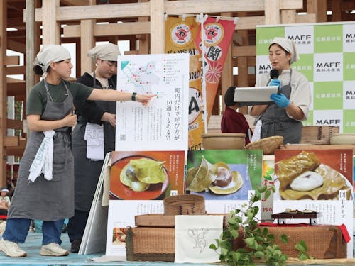 通りかかった見知らぬ方に、その葉っぱ、懐かしいもん持って来てるやんかぁ!と。どちらからお越しか伺うと、三重県からと。 そうですよね!と、そこから話題が広がって懐かしい食の話に花が咲く・・・この取り組みをしていて良かったと思う瞬間に万博会場でも恵まれました。