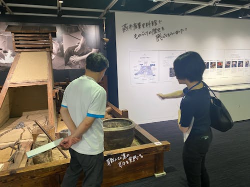 行程② 燕市産業史料館見学し、燕市の産業の歴史について触れていただきました。もし移住をしたら、ものづくりの会社に入りたいと事前のオンライン移住相談でお話しており、実際に職人たちの作品や製造工程を見て、とても感動していました。