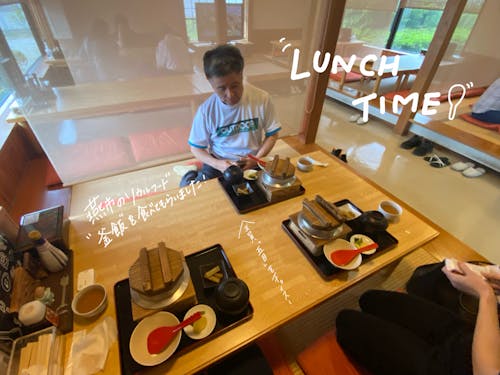 行程③ 昼食は、Iさん希望の”釜めし”にしました!釜めしは燕市のソウルフードの一つです!釜めしは誕生日や進級などの”ハレの日”に食べられることが多く、釜めしを食べることが団らんの象徴になっていったと言われています!アツアツで具材がごろごろの釜めしは絶品でした!Iさんも「上品な味わいでとっても美味しかった」と5分ほどで平らげていました☆