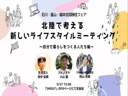 2021/01/19北陸3県(石川・福井・富山)が一体となって行う連続オンライン移住セミナーが始まります!! 「北陸で考える新しいライフスタイルミーティング」は、北陸にゆかりのあるゲストや北陸で多様な暮らし方を実践している方をゲストにお招きし、そのリアルな声を皆様にお届けする無料オンラインイベントです。