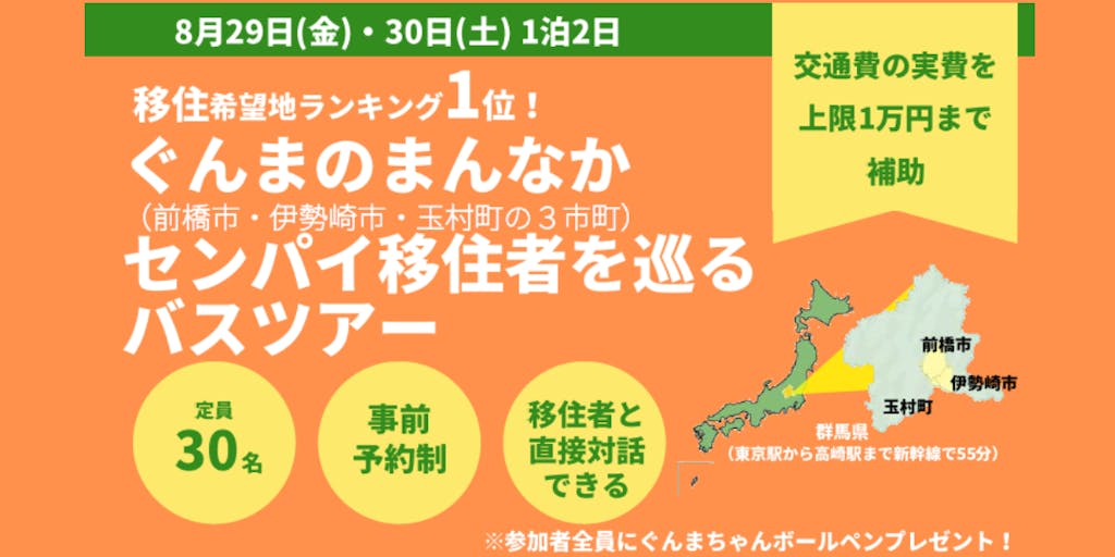 2025/08/062024年移住希望地ランキング1位で話題沸騰中の群馬県! その群馬県のまんなかに位置し、都心からのアクセスも1時間程度の前橋市・伊勢崎市・玉村町が今回の舞台。 バスツアーでは、群馬県に移住して、3市町の企業で働いている3名の“ホンネ“を聞き、夕方はセンパイ移住者との交流会へ参加。2日目は、3市町の観光・生活スポットを巡り群馬県での生活のイメージを膨らませてみませんか?