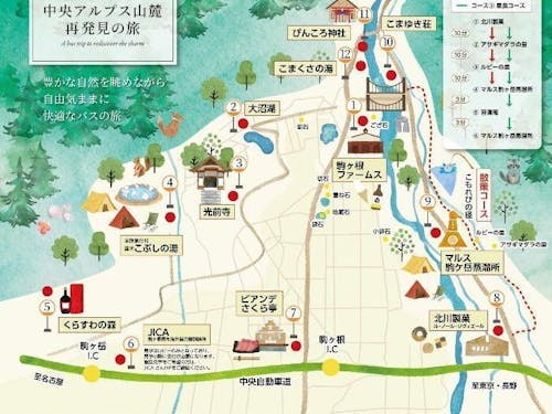 ■運行期間:令和7年7月4日(金)~令和7年12月1日(月) ■運行日:金曜日〜月曜日、祝日の限定運行(8月は毎日運行) ■運賃(1日乗車券): 大人(中学生以上)1,500円 小学生以下は無料 ※乗り降り自由です。乗車時に、乗務員からチケットをご購入ください。 ■運賃(1回乗車): 大人(中学生以上)500円 小学生以下は無料 ※全区間均一運賃。乗車時にお支払いください。 ■支払い方法:現金、QR決済(paypay、d払い、auPAY、メルペイ) ■定員:24人 ■停留所:下記12ヶ所 ・駒ヶ根ファームス ・大沼湖 ・光前寺 ・露天こぶしの湯(家族旅行村) ・くらすわの森(養命酒駒ヶ根工場) ・JICA(駒ヶ根青年海外協力隊訓練所) ・ビアンデさくら亭 ・北川製菓 ・マルス駒ヶ岳蒸溜所 ・こまゆき荘 ・ぴんころ神社(二人静) ・こまくさの湯