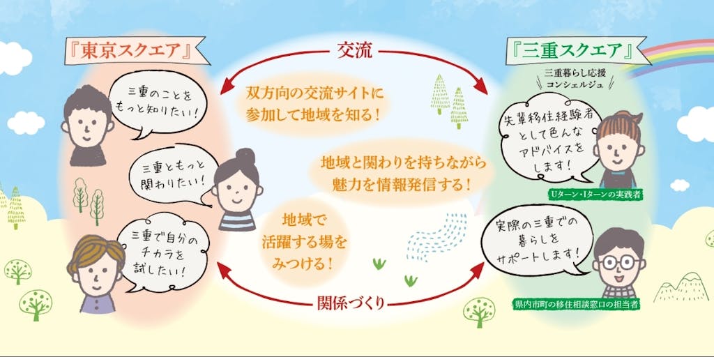 こんにちは! 三重暮らし魅力発信サポーターズスクエア事業は、首都圏在住の三重県との繋がりを持ちたい方で構成された『東京スクエア』 メンバーと、三重県在住の先輩移住者や地域で活動する人たちで構成された『三重スクエア』メンバーとの交流と関係づくりを目的としています。 『東京スクエア』のメンバーになると、 『三重スクエア』のメンバーと交流するイベントへの参加や、 三重暮らし交流サイト<ちゃっとみえ、ちょっとみえ>を通じてオンラインで 親交を図ることが出来ます。 『三重スクエア』のメンバーは、三重にの移住された方や 県内市町の移住相談窓口担当者なので、みなさんが不安に思う内容にも 親身に相談に乗ってもらえるほか、 時には、リアルな “ここだけの内緒話”が聞けるかもしれません。 まずは、首都圏に住むメンバー同士で、『三重での暮らしについて』語り合いましょう! 随時、イベントも公開しますので、お楽しみに!