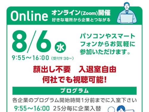 〈オンライン(Zoom)開催〉 8月6日(水)9:55~16:00(25分毎に企業入れ替え) ・参加費無料、顔出し不要、入退室自由、当日参加もOK
