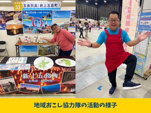 Q:新上五島町を知ったきっかけは何ですか? ======================= A:たまたま観ていたテレビ番組で新上五島町が特集されていて知りました。その当時はお笑い芸人をしていたんですが、「島に移住!良いじゃん!」と思って、元々地域おこし協力隊というものがあることは知っていたので、「新上五島町 地域おこし協力隊」で検索して、すぐに応募しました。