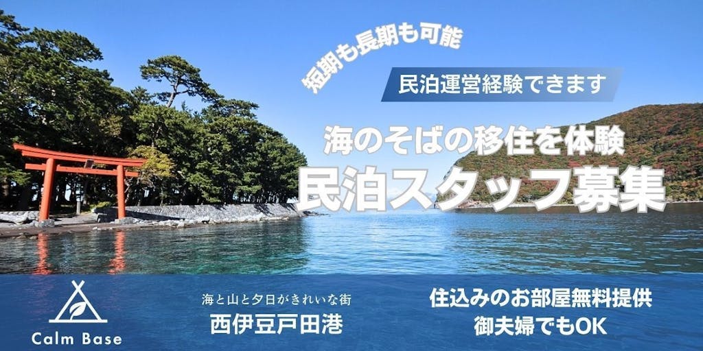 はじめまして!私たちは静岡県沼津市の西海岸、美しい夕日が自慢の町・戸田(へだ)で、民泊「Calmbase西伊豆」を運営しています。今回、私たちと一緒にこの場所を盛り上げ、お客様に最高の思い出を届けてくれる「夏の仲間」を募集します。 これは単なるアルバイト募集ではありません。 あなたの人生にとって、忘れられない夏を約束する「暮らしへの招待状」です。
