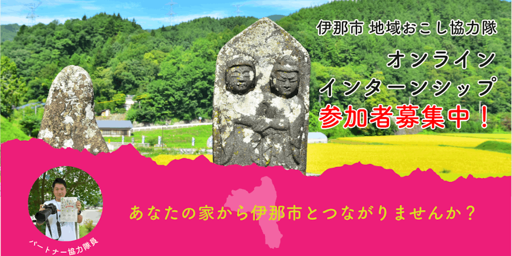 「一緒に地域をつくりましょう!」 伊那市地域おこし協力隊とともに地域課題を解決に向けて活動するオンラインインターンシップを開催します。各隊員が抱える課題や未来へつなげる活動にオンライン上で参加。隊員とともに企画を立案し、実践します。 終了後にはオンライン報告会を実施。活動内容を全国に配信します。 ・活動時間 週5時間程度 ・謝礼 なし 詳細については「興味ある」を押してください。