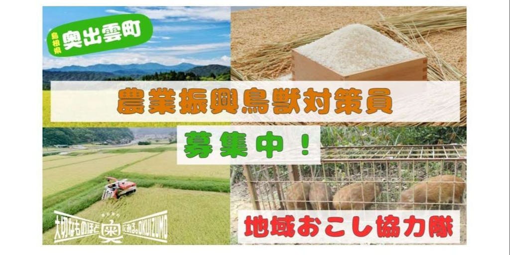 2025/09/13【農業振興鳥獣対策員とは】 一般社団法人奥出雲町農業公社の一員として農業振興全般に関わっていただきます。また、奥出雲町ではサルやイノシシ等の有害鳥獣による農作物被害が多発しています。地域住民や奥出雲町有害鳥獣捕獲班等と連携し有害鳥獣対策に取り組み、地域住民が安心して生活できる環境をつくり、町の基幹産業である農業の振興を図ります