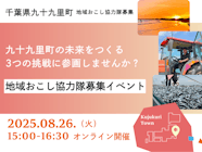 【応募方法】 ・九十九里町地域おこし協力隊応募用紙、住民票を九十九里町企画政策課にご提出ください。 (九十九里町企画政策課 〒283-0195 千葉県山武郡九十九里町片貝4099) ※詳細は以下の九十九里町ホームページをご参照ください。 https://www.town.kujukuri.chiba.jp/0000003412.html