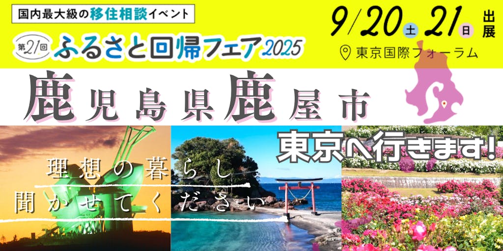 2025/09/11あなたのライフスタイルを考える、日本最大級の移住フェアが東京で開催されます! 全国から、のべ700の自治体・団体が大集合!担当者が『直接』、暮らしや仕事、地域に関する情報など、移住に関するご相談に個別にお答えします。 移住に興味のある方や、どんな町があるんだろう?ちょっとのぞいてみようかな?でも大丈夫!ぜひこの機会にふるさと回帰フェアへお越しください。鹿屋市をはじめ、たくさんの出展ブースでご相談をお待ちしています♪