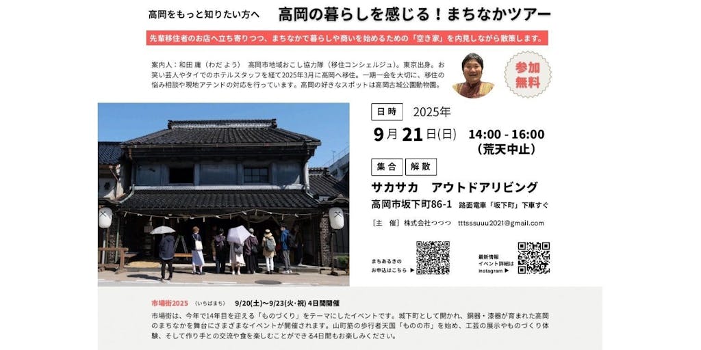 ~ イベント内容 ~ ◎ 日時 : 2025/9/21(日)14:00~16:00(荒天中止) ◎ 会場 : サカサカ アウトドアリビング 富山県高岡市坂下町86-1 路面電車 万葉線「坂下町」下車すぐ ◎ 参加費 : 無料 ◎ 締切 : 先着10名様程(応募の状況により予約なしの当日参加も可能です) ◎ 内容 :・高岡の空き家を実際に内見します ・ちょっと裏道へ...暮らしの風景が感じられます ・高岡へ移住した方や新しいことを始めた方へお話を伺います (予定:ゲストハウス、カフェ、工房など)