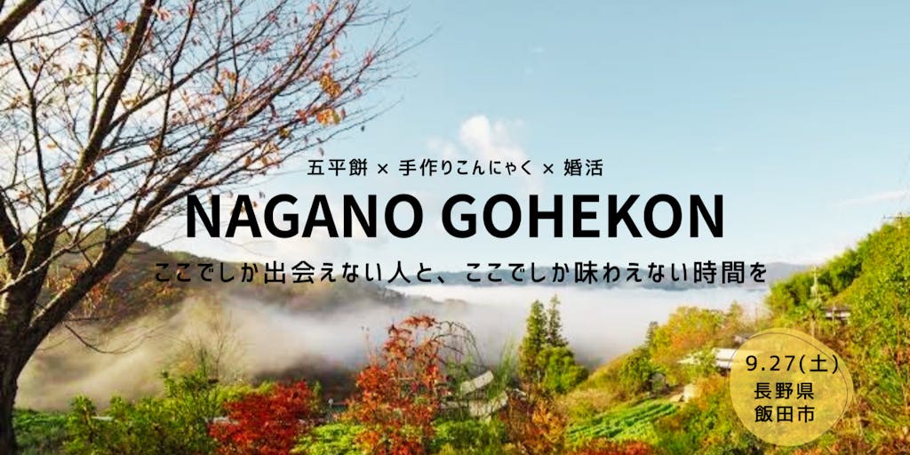 日時:9月27日(土)9:30~15:00頃 内容:五平餅&こんにゃく作り体験&ランチ 参加費:2,000円 対象者:移住を考えている40歳までの独身男女