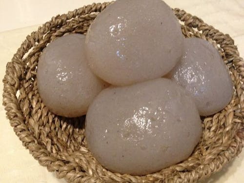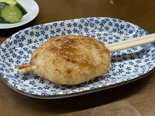 五平餅(ごへいもち)とは、ご飯を多少粒が残る程度につぶした(「半殺し」)ものをわらじ型、もしくは団子型に整形し、串に刺してタレをつけて焼いたものです。タレは味噌や醤油をベースにし、胡桃や胡麻、山椒の芽などを加えて作ります。五平餅の由来は、神道において神に捧げる「御幣」の形をしているからといわれていて、この地方に伝わる郷土料理です。