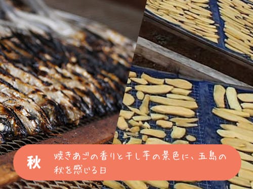 ◯秋(9〜11月) 五島の秋は、静かに訪れます。紅葉が鮮やかに色づく…というタイプの秋ではなく、空が高くなったり、風が気持ちよく感じたり、そういう「感覚」でわかる季節の変化です。運動会、文化祭、敬老会、スポーツ大会など行事が多く、地域に人が集まる季節。 「かんころ餅」の原材料となる、スライスしたさつまいもを茹で干しする光景や、あご(トビウオ)を焼く匂いで、食の面でも秋を感じるようになります。 10月くらいまでは台風が来ることもありますが、だんだんと「そろそろ落ち着くだろうね」という空気に変わっていきます。11月に入ると朝晩は冷え込み、そろそろ冬支度の準備を始める家も。