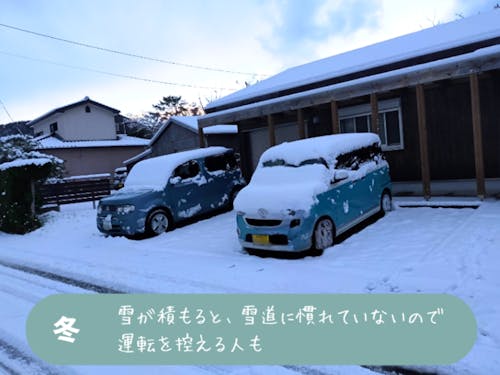 雪が積もるのは年に何回かですが、刺さるような冷たさに出かける気力がなくなることも。エアコンだけではつらいので、こたつ・湯たんぽ・電気毛布などをフル活用しています。そして冬は、北西の風が強く、船の欠航が増える季節です。ちなみに数年に一度レベルの大雪のときは、車のタイヤチェーンやスタッドレスタイヤを持っていない人も多く、運転を控え、歩いて職場に出勤している姿が見られます。