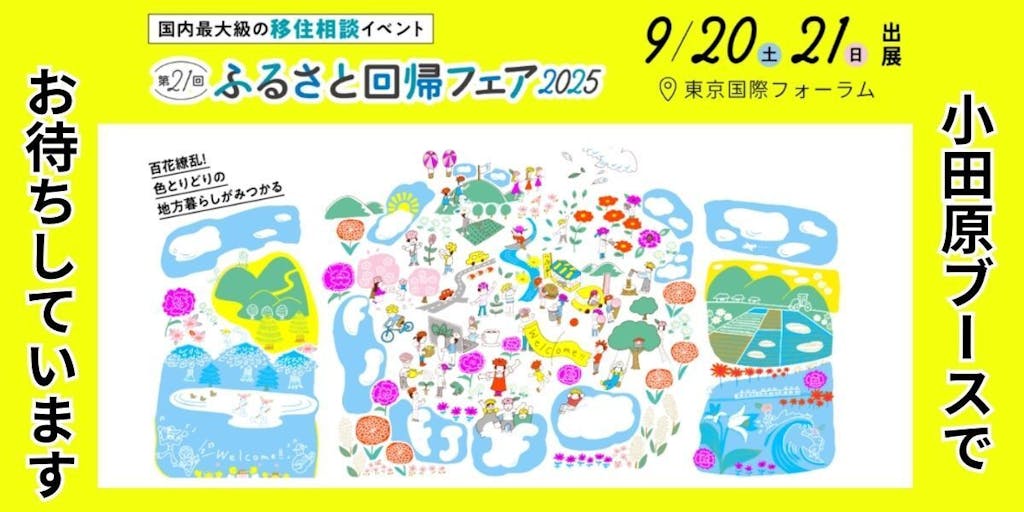 2025/09/16全国から延べ700を超える自治体が集まる、国内最大級の移住イベント「第21回ふるさと回帰フェア2025」に、小田原市も2日間出展します!(入場無料・相談も無料)