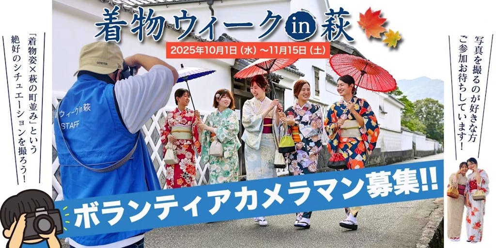 さて、そんな『着物ウィークin萩』ですが、このイベントでは“美しく撮り隊”というボランティアカメラマンを募集しています! イベント期間中の萩城下町周辺は、写真好きの方にとっても魅力的なシチュエーションですよね⭐︎ “我こそは!と思う方”、“ちょっと興味あるなぁ”と思う方、ぜひ上記のURLをチェックしてみてくださいね。 また、参加申込書や募集の詳細は下記のリンクに記載がありますので、 ご確認の上ご応募ください。 https://x.gd/1kNs5 最後まで読んでいただき有難うございました♪ よろしければ<<興味ある>>ボタンをポチっとお願い致します。 “中の人”がとても元気になります(笑) それではまた、次のプロジェクトでお会いしましょう✨