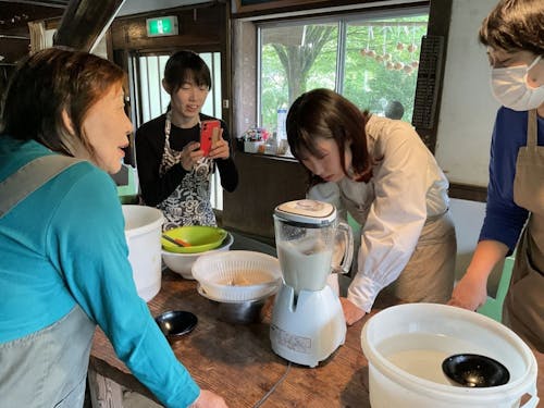 とくに人気なのはこんにゃくづくり。今では珍しくなった木灰を使った昔ながらの製法で、こんにゃくいもを丁寧に練り、ぷるぷるとしたこんにゃくが出来上がっていく様子は、まさに感動的。温かい出来立てのこんにゃくは、ふわふわとした食感と優しい味わいが口いっぱいに広がり、「こんなにおいしいこんにゃくは初めて!」と驚く人も多いのだとか。