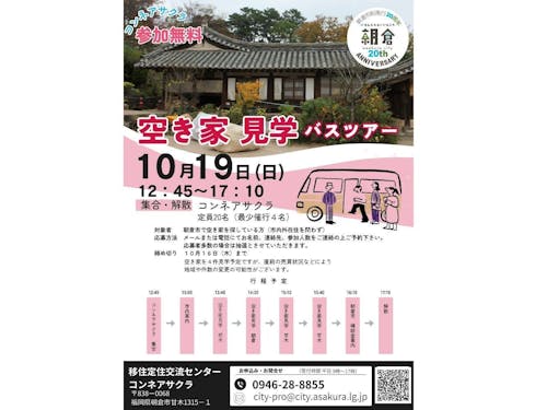 2025/10/08朝倉市の空き家をバスでご案内致します。 道中の車内で施設や地域の特徴などをご紹介しながら空き家を見て廻ります。 空き家を4軒(売買状況によって3軒の可能性あり)見学するツアーとなっております。