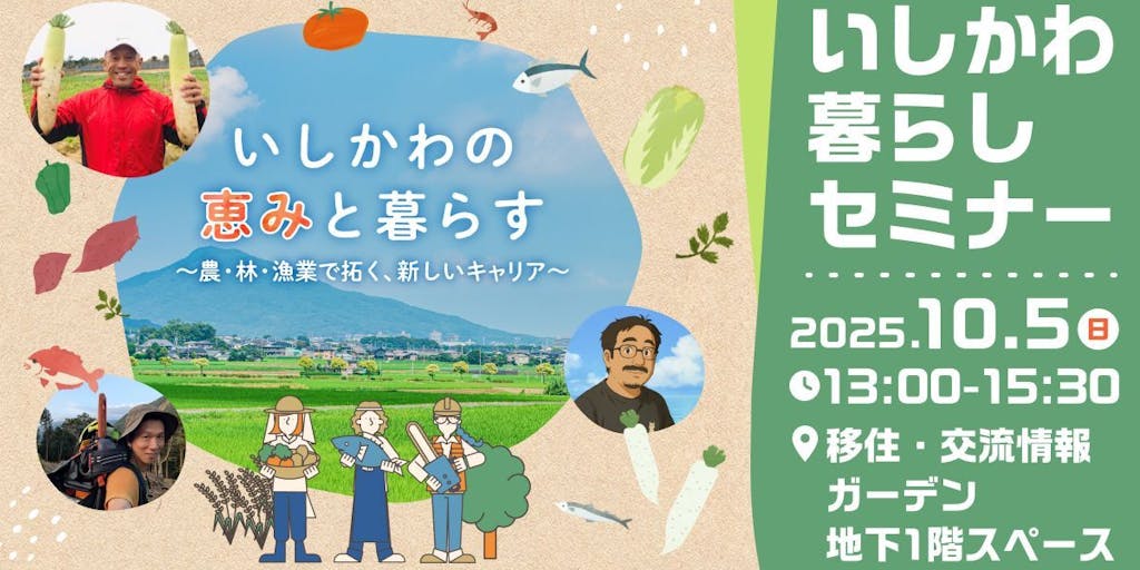 2025/10/03未経験から農業・林業・漁業に飛び込んだ移住者のリアルな体験が聞けるセミナーを開催します! 「どうやって始めたの?」「暮らしはどんな感じ?」そんな疑問にこたえるトーク満載! 石川県の支援制度も紹介するので、初めてでも安心です。 自然の中で働く暮らしに、ちょっと興味がある方も大歓迎。 お気軽にご参加ください!お待ちしております。