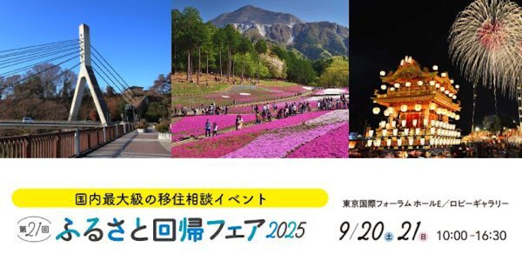2025/09/112025年9月20日(土)・21日(日)に行われる、国内最大級の移住イベント「第21回ふるさと回帰フェア2025」に、秩父市も2日間出展いたします。参加されたい方は、「ふるさと回帰フェア2025」Webサイトよりお申込み下さい。