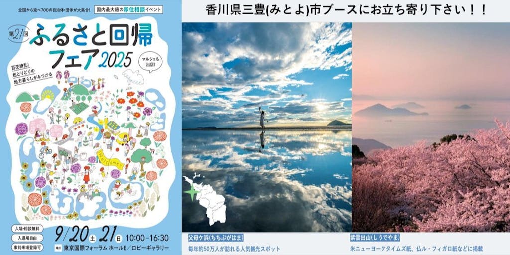 2025/09/162025年9月20日(土)・21日(日)に行われる、国内最大級の移住イベント「第21回ふるさと回帰フェア2025」に、かがわ県ブースの一員として、三豊市も出展いたします。9/20(土)のみの参加いたします!気軽にお越しください!