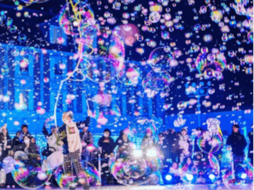 ・音響に合わせてリズムよく舞い上がるシャボン玉 ・スポットライトに照らされて虹色に輝く無数の泡 ・観客の目の前で次々と形を変えて生まれる「光のオブジェ」