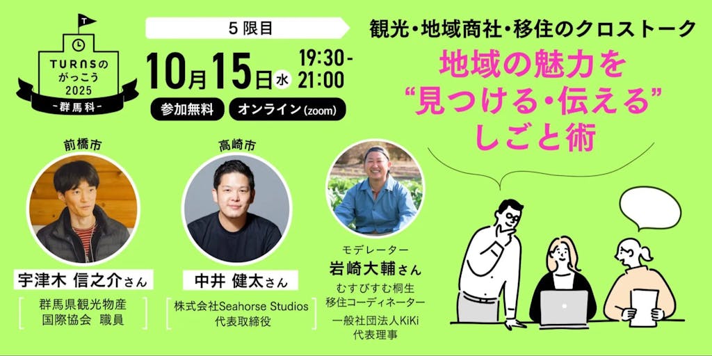 【10/15(水) 19:30-|オンライン】 ― 観光・商社・移住のクロストーク ― 地域の魅力を ”見つける・伝える” しごと術(TURNSのがっこう群馬科2025・5限目)