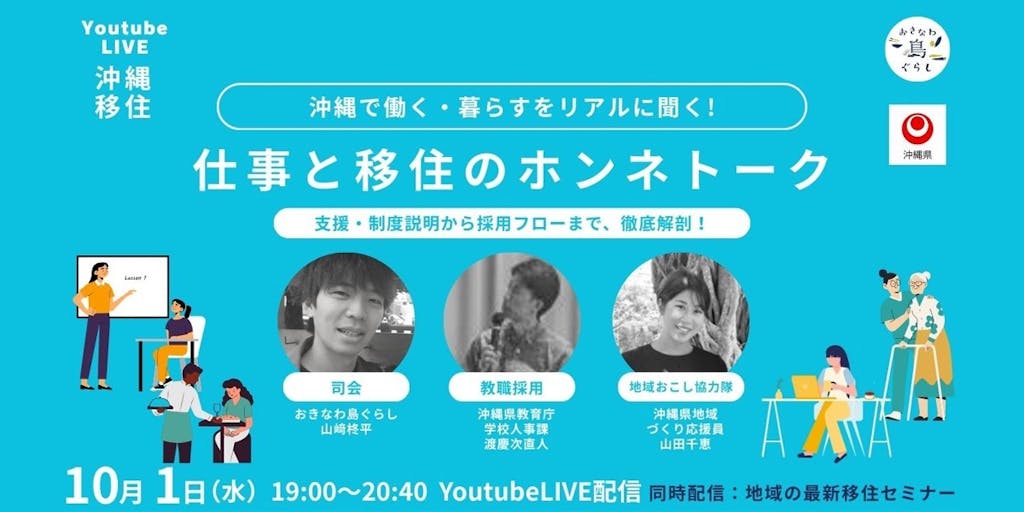 10月1日(水)19時より、沖縄県主催の移住セミナーをYouTubeLIVEで配信します。テーマは、移住希望者が最も気になる「仕事」。前半は、沖縄県教育庁担当者に教員採用の流れや仕事内容を伺う「ホンネトーク」、さらに地域おこし協力隊の最新募集情報を県地域づくり応援員が解説します。後半は沖縄県や市町村の担当者によるリレーセミナー。石垣市・伊是名村・久米島町などの地域から、移住体験や住宅、地域の最新情報を直接知ることができます。チャットで気軽に質問も可能。沖縄での「働く」と「暮らす」をリアルに体感できる90分。事前エントリーで視聴URLを受け取り、ぜひご参加ください。