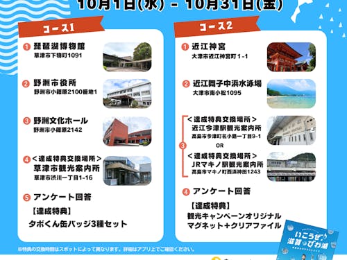 ・達成特典 コース1 缶バッジ3種セット※先着300個(なくなり次第終了) ※全期間において1人1個まで ・達成特典交換場所:コース1 草津市観光案内所 ・交換時間:9:00~17:00 各チェックインスポットについてはチラシを確認してください!