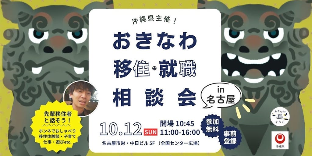 2025/10/102025年10月12日(日)、名古屋・栄の中日ビルにて「おきなわ移住・就職相談会」を開催します。沖縄県、石垣市、大宜味村、渡名喜村、久米島町の相談員が参加し、暮らしや住まい、子育て、支援制度など、移住に関するご相談を承ります。さらに「仕事」に関する不安に応えるため、沖縄の就職支援を行う「りっか沖縄×観光人材マッチング」、教員採用の担当者、地域おこし協力隊も出展。実際に県外から移住した「先輩移住者」から体験談を聞ける特設ブースもご用意しています。入退場自由、受付後は興味のあるブースから自由に相談スタート。沖縄移住に興味があるけれど「何から始めていいか分からない」という方に最適な機会です。