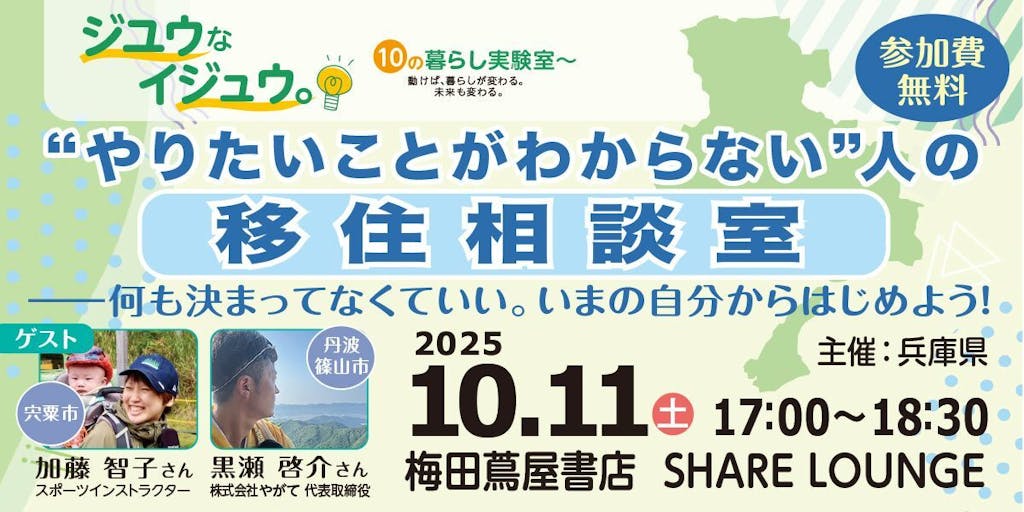 2025/10/0610/11(土)に大阪にて、兵庫県主催セミナー「“やりたいことがわからない”人の移住相談室―何も決まってなくていい。いまの自分からはじめよう!」を開催します!