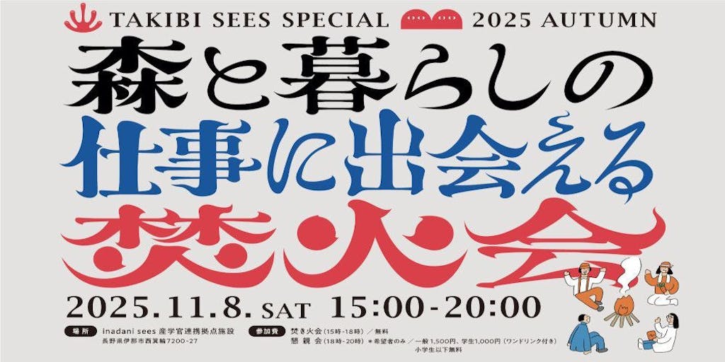 ※人数把握のため、懇親会に参加されない方もフォームからお申込みをお願いします。 【申込期限】 ・焚火会への参加申込み:2025年11月7日(金)中 ・懇親会参加のご予約:2025年11月1日(土)中