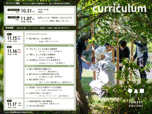 今年のテーマ「森との関係性再考」に沿って、現地とオンライン講座を以下の予定で開講いたします。 参加コースは2つのコースから選択いただけます。