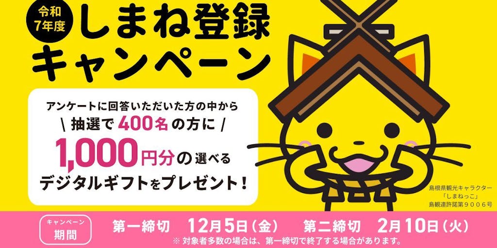 2025/10/13【しまね登録&アンケート回答で抽選400名様にデジタルギフトが当たる!】 今年も『しまね登録キャンペーン』がスタートしました! 島根のお仕事情報が知りたい方、移住イベント情報が知りたい方など、この機会をお見逃しなく✨