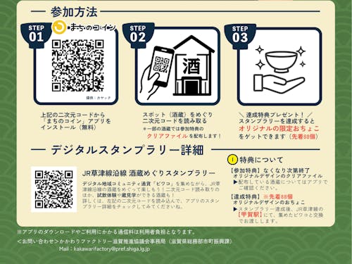 【内容】 デジタル地域コミュニティ通貨「ビワコ」を使いながら、JR草津線沿線の酒蔵をめぐるデジタルスタンプラリーです。