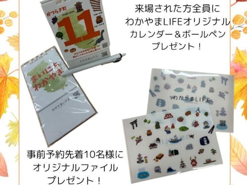・来場された方全員に「わかやまLIFEオリジナルカレンダー」と「わかやまLIFEオリジナルボールペン」をプレゼント🍊✨ ・事前予約された方先着10名に「わかやまLIFEオリジナルクリアファイル」をプレゼント
