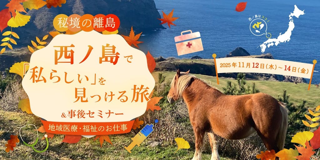 2025/10/11島根県西ノ島は、国賀海岸をはじめとする、ダイナミックな自然景観が楽しめる島です。 近海の豊富な資源を活かした海の幸が特産品で、牛や馬があちこちで放牧飼育されています。 隠岐ユネスコ世界ジオパークを 代表する絶景に囲まれた島の暮らしと、地域の人に寄り添った医療・福祉を見てみませんか? 求人募集中の医療機関にも実際に訪問します。 後日、リアル開催の事後セミナーで再会しましょう♪