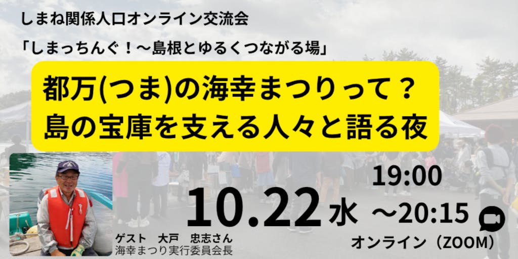 しまね関係人口オンライン交流会 【10/22開催】第2回しまっちんぐ~島根とゆるくつながる場~ 【都万の海幸まつりって?島の宝庫を支える人々と語る夜 】