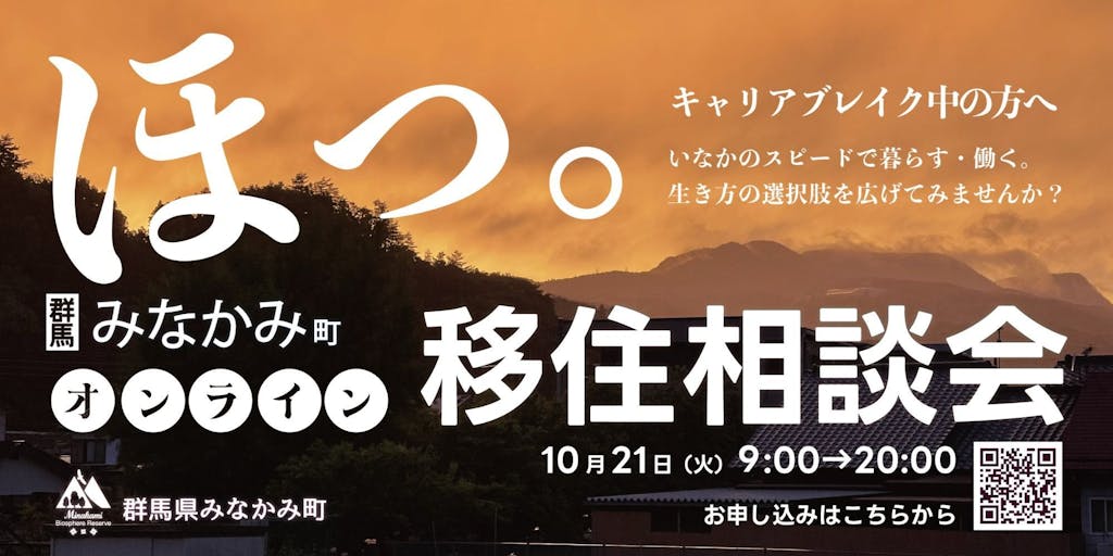 10月21日(火)開催/いなか暮らしを生き方の選択肢に。キャリアブレイク中の方必見!みなかみ町オンライン田舎暮らし相談会