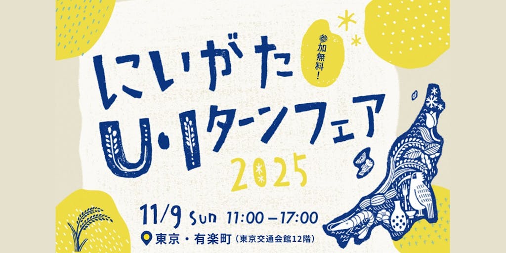 2025/10/23新潟県内の市町村&関係団体が一堂に集まる、新潟県最大の移住マッチングイベント「にいがたU・Iターンフェア2025」が、2025年11月9日(日)に東京・有楽町で開催されます。