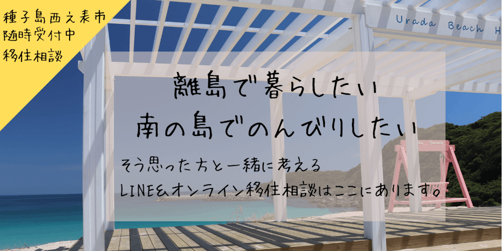 種子島のことを知らない方は、気軽にまずはLINEで相談ください。 移住に関するどんなワードにも対応できるLINEが完成しました! 年末年始「移住」を思い立っても良いじゃない!行政機関が休みだから無理だ・・・とあきらめるにはちょっと早い! 公式LINEアカウント「たねがしま西之表移住定住情報」があなたの助けになります! https://lin.ee/y7pIrJJ