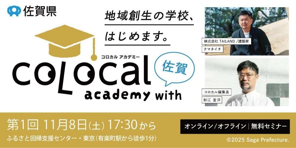 2025/10/29佐賀県と「コロカル」が連携し、「自分らしく地域を盛り上げる方法」を学べるセミナー『コロカルアカデミー with 佐賀』を開催します。 会場は東京・有楽町、オンラインでも参加できます!