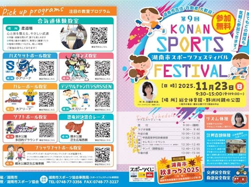 2025/11/04滋賀県湖南市は、市の中心部に一級河川である「野洲川」が横断しています。 水と緑に囲まれた自然豊かな「野洲川親水公園」と、湖南市総合体育館で「湖南市スポーツフェスティバル」が開催されます!