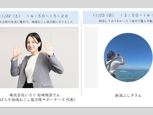 ◇ステージイベント ・11/22(土) 11:30~12:00 浅野ゆう子さんトークショー 14:50~15:20 株式会社いろり 松崎侑奈さん(いばらき地域おこし協力隊サポーターズ 代表) 「海のある街の生活に憧れて、地域おこし協力隊になりました」 ・11/23(日) 11:20~11:50 はなわさんお笑いライブ&トークショー 13:50~14:20 新潟ふしぎさん 「移住してみてわかった!地方で暮らす魅力」