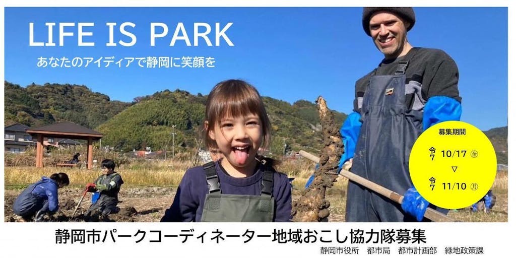 2025/11/09静岡市では、多様な主体の連携による柔軟な公園運営を実現することを目的として「パークコーディネーター地域おこし協力隊員」を募集します! 隊員には、地域、企業、行政、公園関係者など、公園を取り巻く多様な主体をつなぎ、中立的な立場から公園の運営支援等を行う中間支援機能(注)を担っていただきます。 (注)中間支援:行政や市民、企業の間に立ち、公園の整備や利活用、市民協働の円滑な推進や実現に向け、関係者間の調整や連携、課題解決に向けた取組