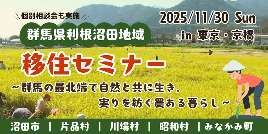 2025/11/02群馬県北部の利根沼田地域(沼田市、片品村、川場村、昭和村、みなかみ町)共催による移住セミナーを東京・京橋で開催します! 「群馬の最北端で自然と共に生き、実りを紡ぐ農ある暮らし」をテーマに、移住者のゲストが利根沼田地域での暮らしぶりを紹介します。