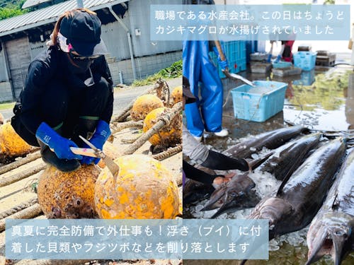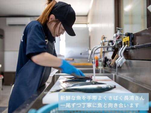 港での仕分けや加工場での作業からスタート。冷たい水に手を浸す重労働もありましたが、苦にはならず、「魚と向き合える時間」が何よりも誇らしく感じられます。 勤め先の水産会社は、30代の若き社長が経営する会社です。10代で会社を継ぎ、事業を拡大してきた経営者は魚の扱いが丁寧で、全国の市場でも高値で取引されるほどの信頼を築いています。 「社長の知識量がすごくて、教えてもらうことばかり」 優秀な経営者のもとで学べる環境が、優子さんの成長を加速させました。 魚屋で捌く基本を学んでいたこと、それまで加工と販売をやりたいと行動していたので、加工や販売も任されるようになり、現在では大手通販サイトに掲載される商品の準備や管理も担当。自分が扱った魚が全国のお客様の食卓へ届くことが、大きな喜びと誇りになっています。 魚の扱い方や美味しい食べ方を伝える活動にも力を注ぎ、地域やイベント、SNSを通じて魚の魅力を発信し続けています。