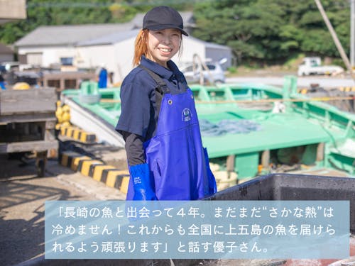 その思いが、人生を大きく動かしました。 魚市場で働くうち、後に勤めることになる上五島の水産会社を紹介してもらう機会があり、この出会いが、優子さんと五島を結ぶ最初の縁となります。