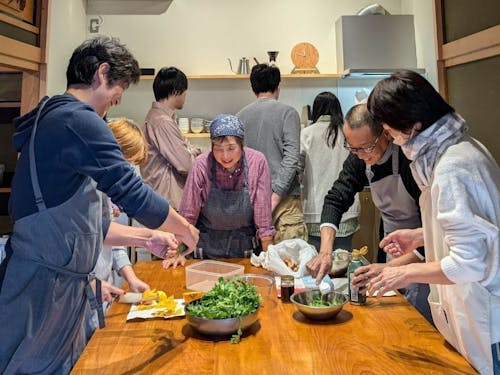 後半は空き家を改修した「METATE HOJO」に移動し、見学をした後、齋藤さんご夫妻と一緒にクッキング。ご主人はかつてフレンチのシェフとして腕をふるっていた方。農園で採れた野菜を主役に、シンプルだけど美味しい調理法を教えてくださいます。キッチンは、古民家をリノベーションした温もりある空間。空間も楽しみながら、旬を味わう贅沢なランチタイムを過ごしましょう。